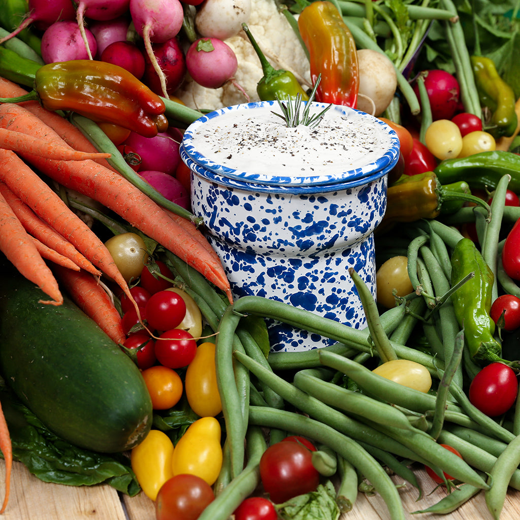 A chip needs a dip. And both are essential for any outdoor gathering. Without refrigeration a cold dip can go bad really quick. Our enamelware Dip Chiller is designed to keep your dips cold when you fill the base with ice and nest the bowl inside.