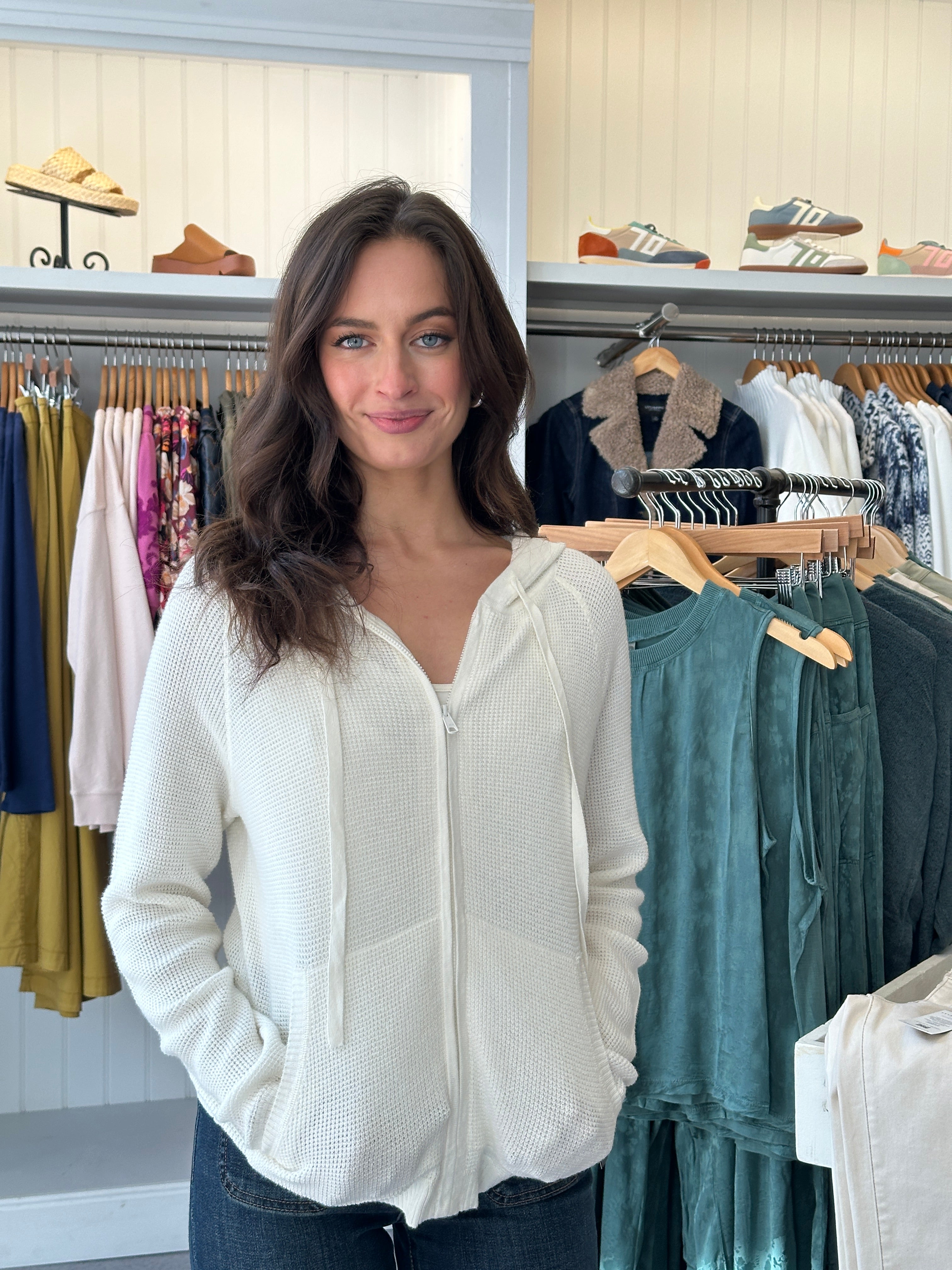 Wrap yourself in cozy comfort with this cream-colored waffle knit zip-up hoodie. Its soft texture makes it perfect for layering on chilly days, while the versatile design effortlessly matches any outfit. Whether you're lounging or out on an adventure, this hoodie adds a playful touch to your everyday look.