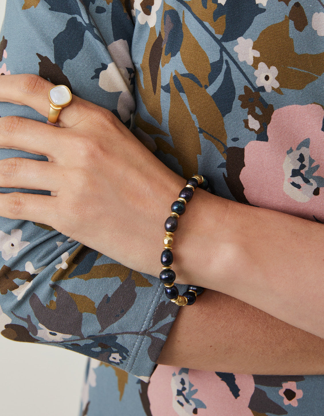 Pearls are a girls best friend. Our Pearl Stretch Bracelet made with grey freshwater pearls and 18kt matte gold plated beads, it's sure to add a little beauty to any look. Dress up or go casual, pearls go with everything!