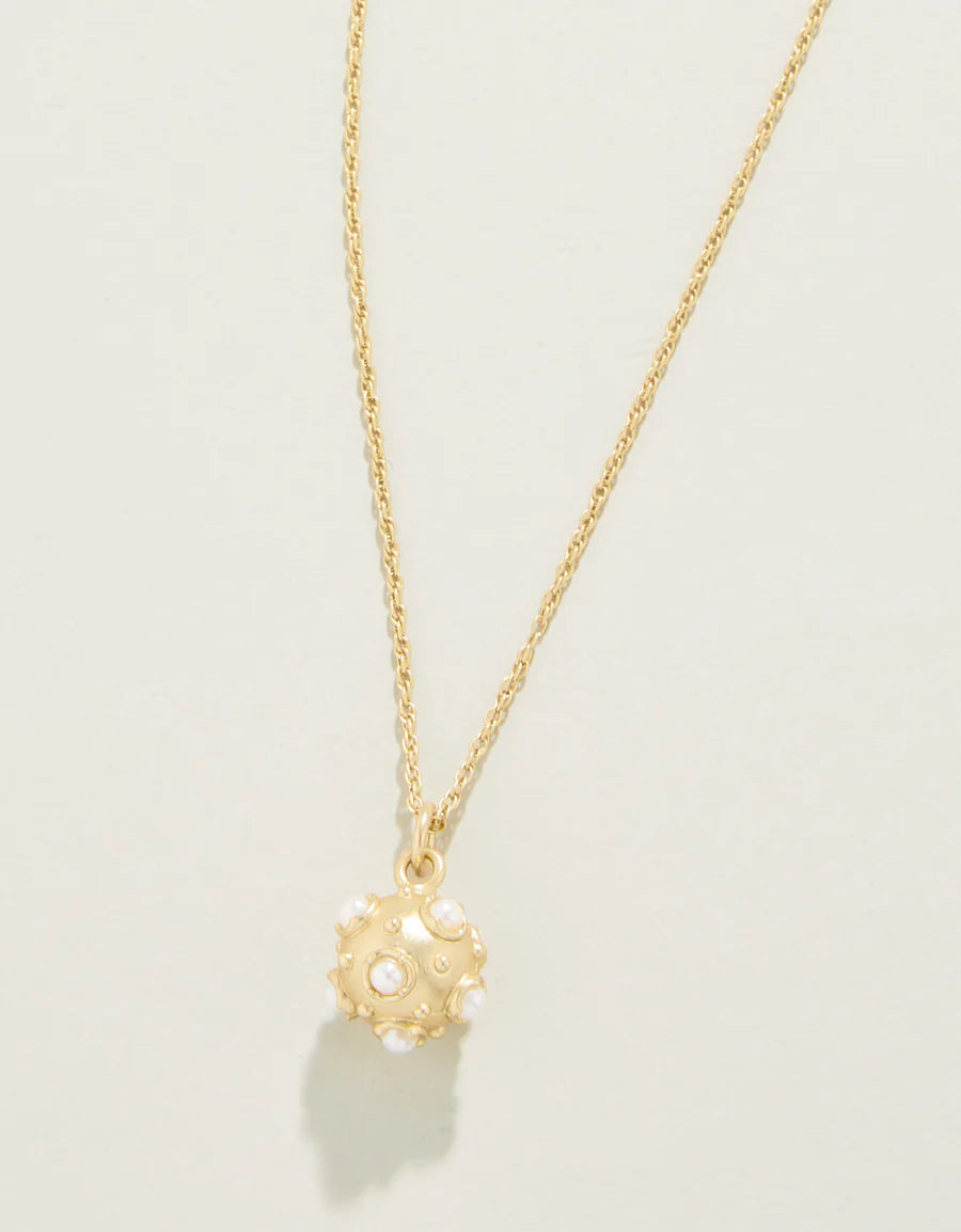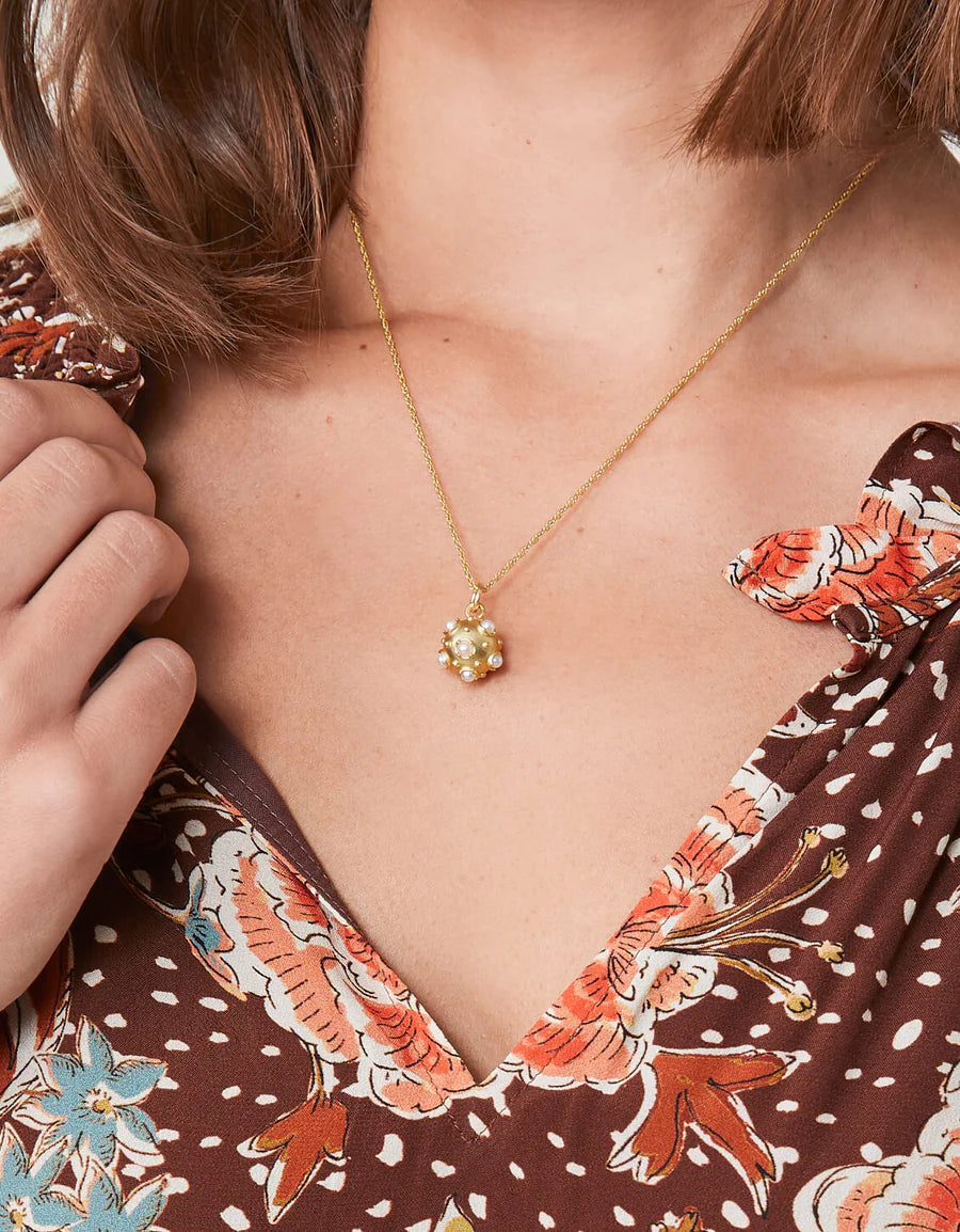 This Vintage Ball Necklace features a classic pendant style encrusted with faux pearls in 18kt matte gold plating. A classic you will be pulling out of your jewelry case again and again.