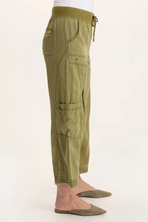 A stretchy, thick knit drawstring waistband ensures extra comfort on this wide-leg Soft Twill cargo style. Plentiful pocket, an added central pleat at the leg for added soft volume, and raw-edge hem round out the utility-inspired style.