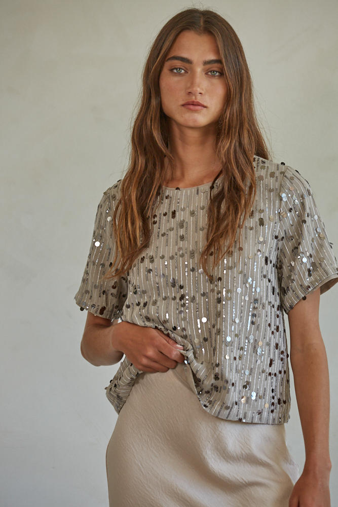 Woven Polyester Chiffon With Sequins Detailed Back Button Slit Detail Round Neck Short Sleeve Top With Lining