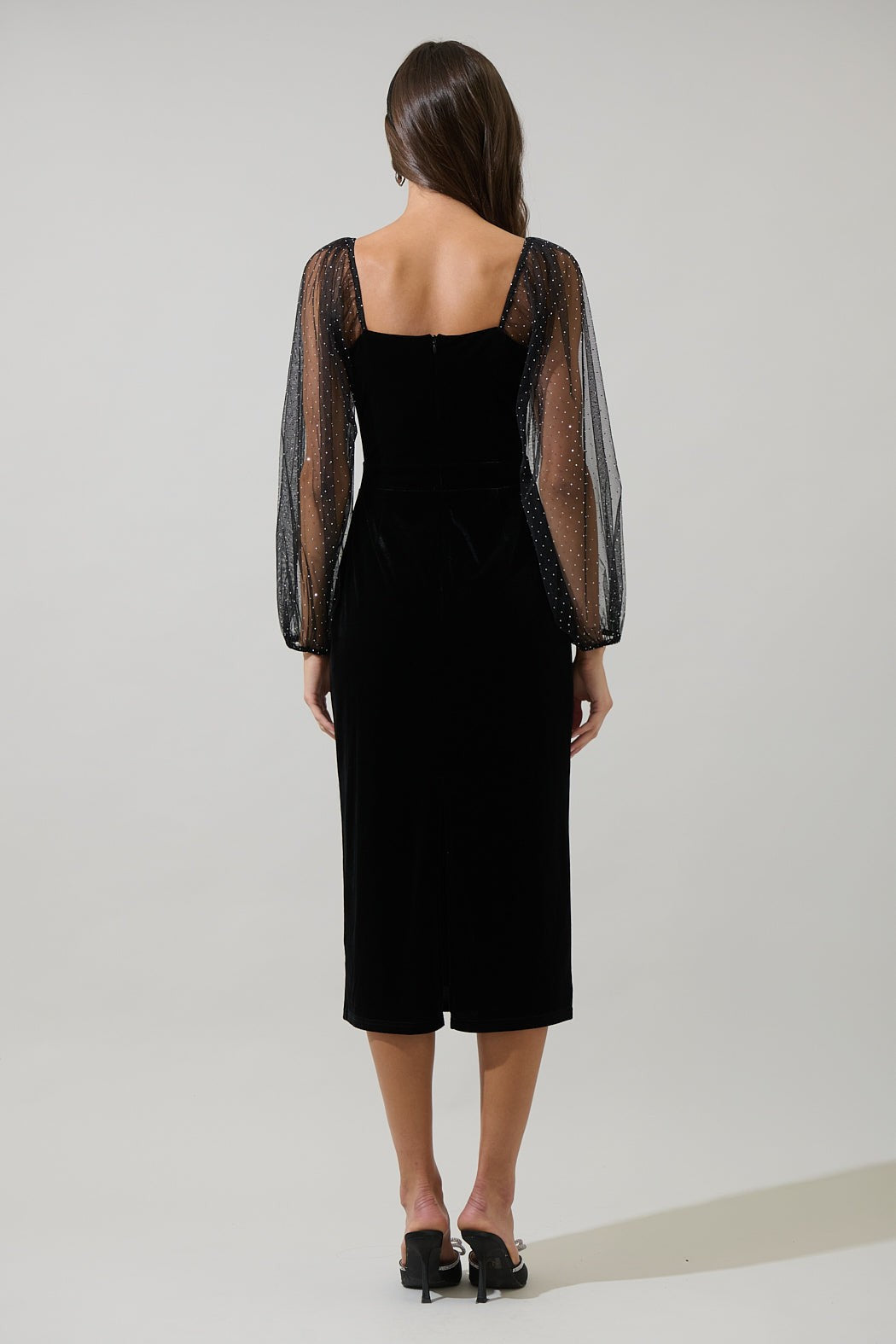 Make a lasting impression with a dress that blends classic charm and modern elegance. This velvet midi dress features long sheer polka dot sleeves, a flattering square neck, and an invisible back zipper for a sleek finish. Pair it with pointed heels and a structured handbag for a chic ensemble. Complete the look with bold earrings to stand out effortlessly.
