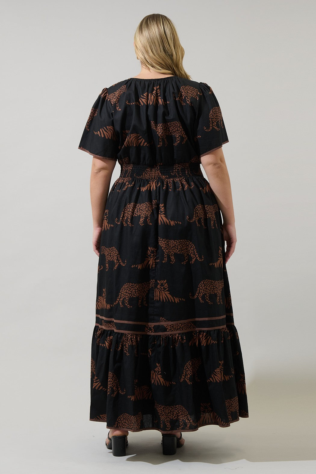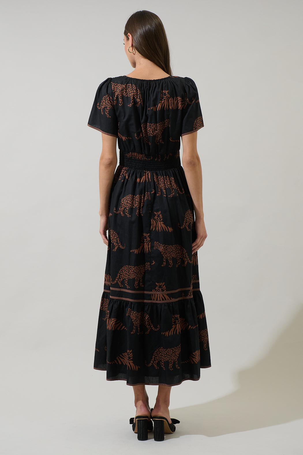 Unleash your wild side with this fierce and flattering dress. Short sleeves frame a split neckline that follows a smocked waistband. The pleated skirt ends at a mid-length, covered in bold leopard and tiger print. Style it with block heels and gold accessories for a confident, standout look.