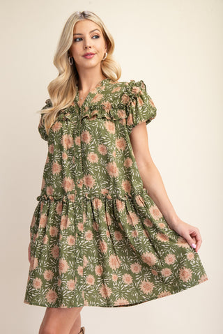 Olive Open Mandarin Collar Puff Sleeve Mini Dress