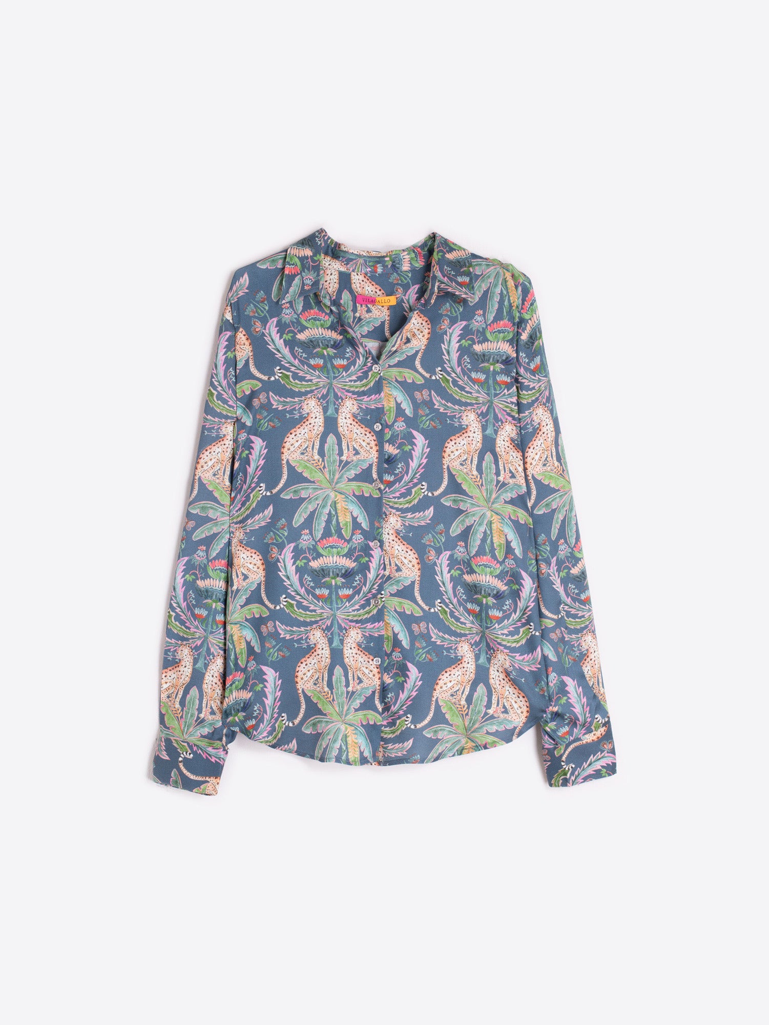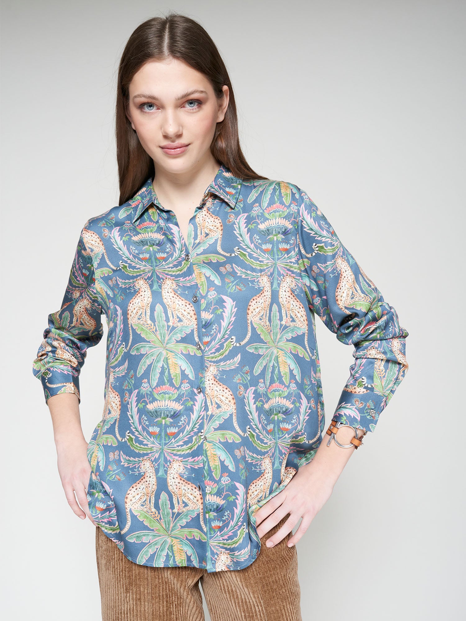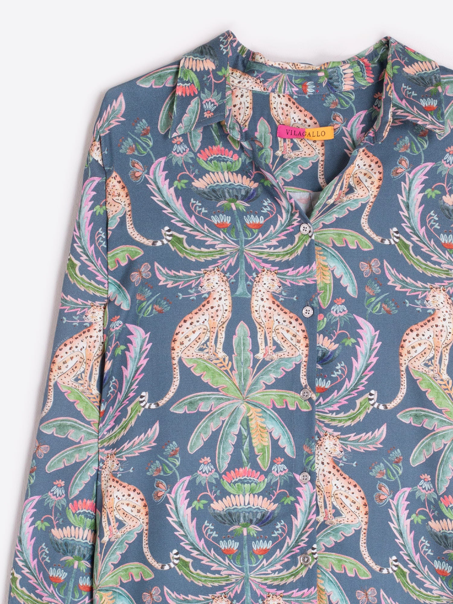 Embrace the wild side with this lightweight Leopard Palmeras Print Shirt, featuring a vibrant jungle-inspired design. Its detailed pattern brings a playful touch to your wardrobe, perfect for sunny days and adventurous spirits.