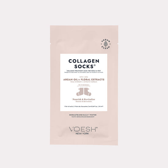VOESH NY's UV-protective Collagen Sock brings innovation to your pedicure treatment. Each sock is pre-loaded with argan oil and collagen-rich emulsion to penetrate and moisturize the skin. Great for softening calluses.