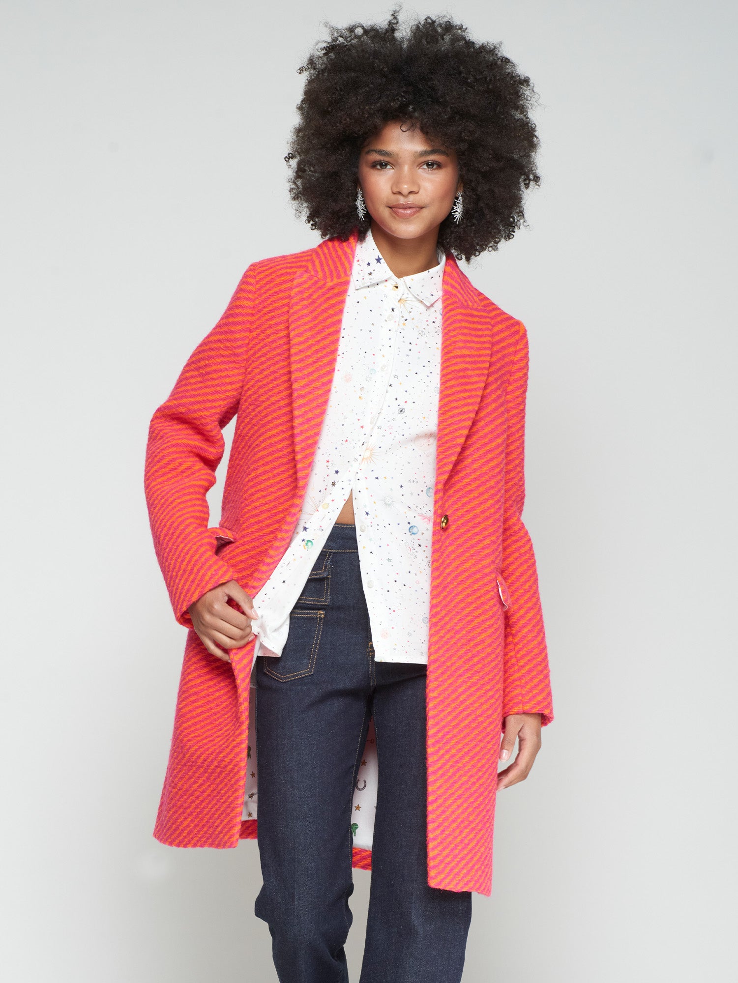 Wrap yourself in vibrant comfort with the Aricia Diagonal Coat. Featuring playful pink and orange stripes, this soft, cool coat adds a cheerful pop of color to any outfit while keeping you cozy and fresh.