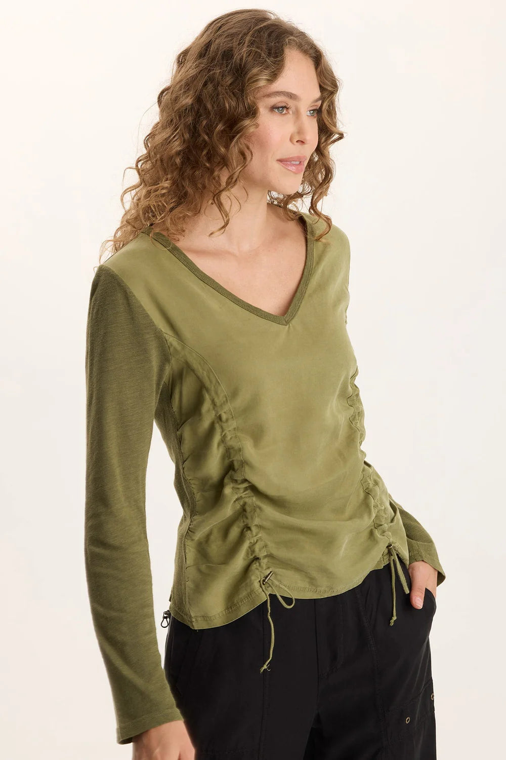 Ketti Long Sleeve Twill/Jersey Ruched V-Neck