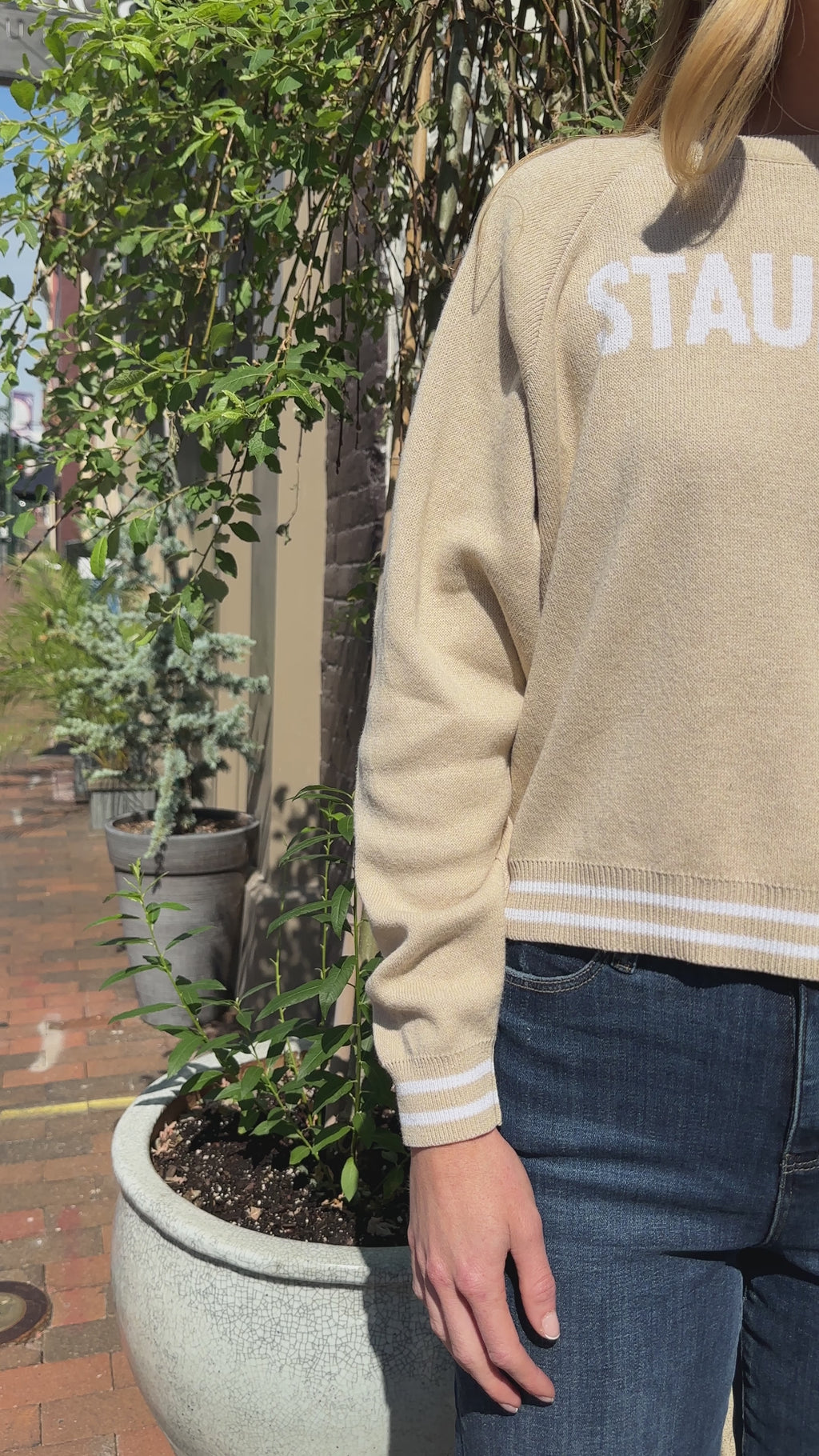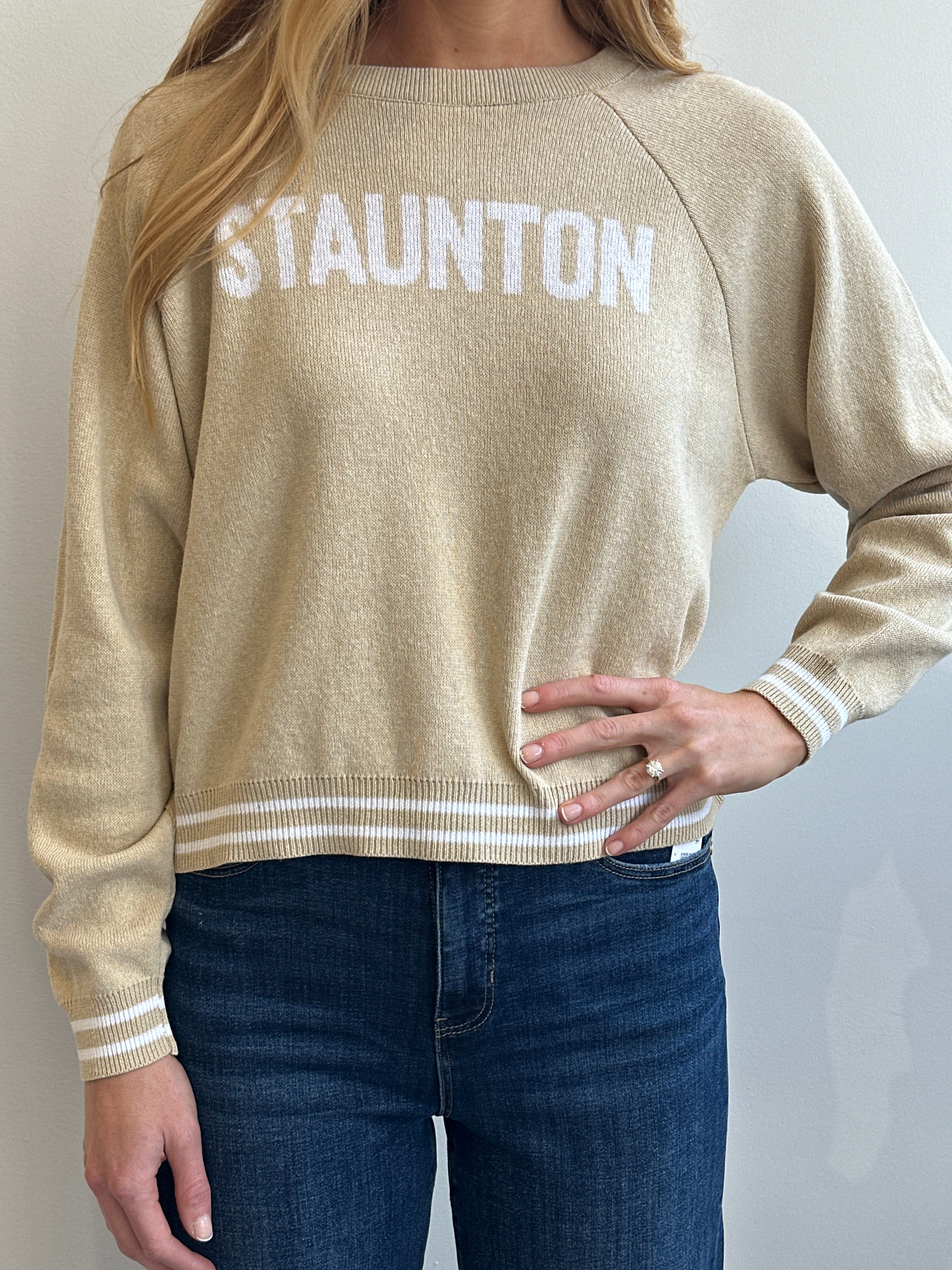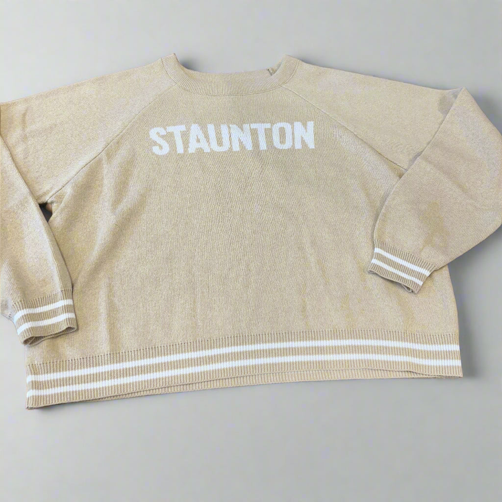 Wrap yourself in the cozy charm of the Staunton Tan Knit, a soft and stylish tribute to the heart of the region. Crafted from recycled materials, this playful piece supports a woman-owned business while keeping sustainability front and center. Perfect for those who love comfort with a conscious twist! WE LOVE STAUNTON Virginia