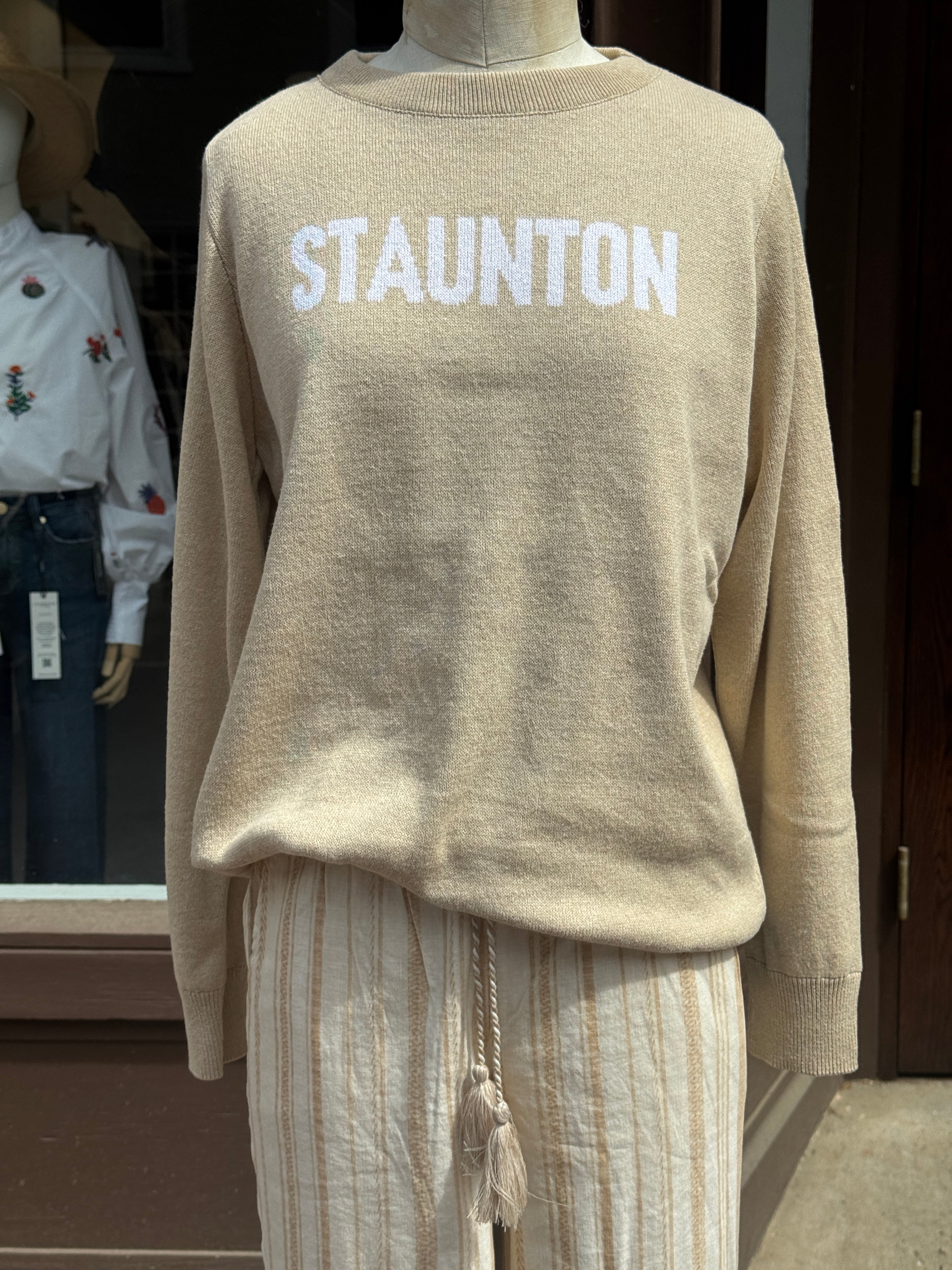 Wrap yourself in the cozy charm of the Staunton Tan Knit, a soft and stylish tribute to the heart of the region. Crafted from recycled materials, this playful piece supports a woman-owned business while keeping sustainability front and center. Perfect for those who love comfort with a conscious twist!