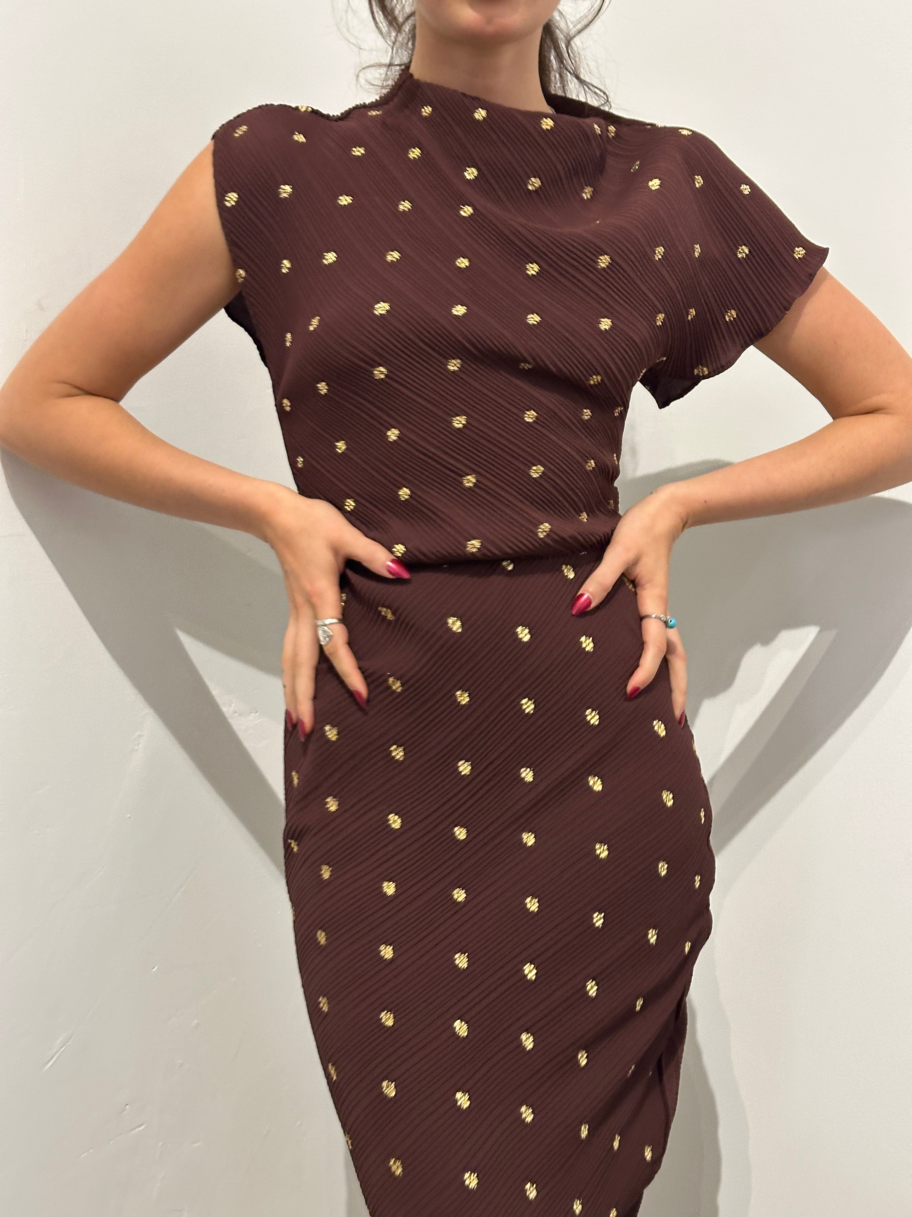 You guys loved our gold fleck plisse print so much we've added another dress to the collection! An a-symmetric top with a high neck and relaxed sleeves, with an elasticated waistband for added comfortability, it's a wedding guest must have!