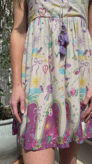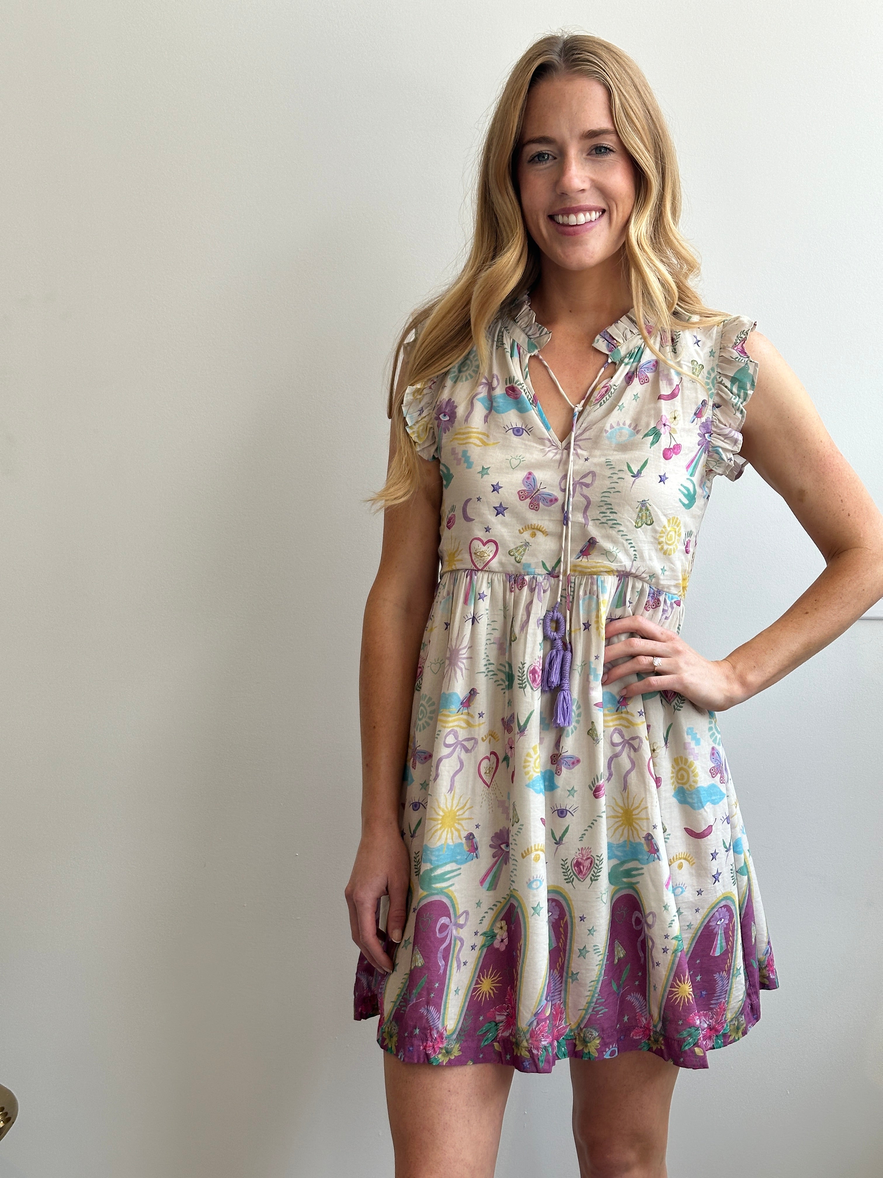 Bold and effortlessly breezy, the Island Twilight Dress is a standout in a deep violet base adorned with tropical florals, lush green foliage, and playful hidden creatures like butterflies nestled among the leaves. The silhouette features a flattering waist, tiered skirt for movement, and sleeveless. Lightweight and easy to wear, it’s the perfect piece for sunset dinners, vacation strolls, or simply bringing a little paradise to your day.