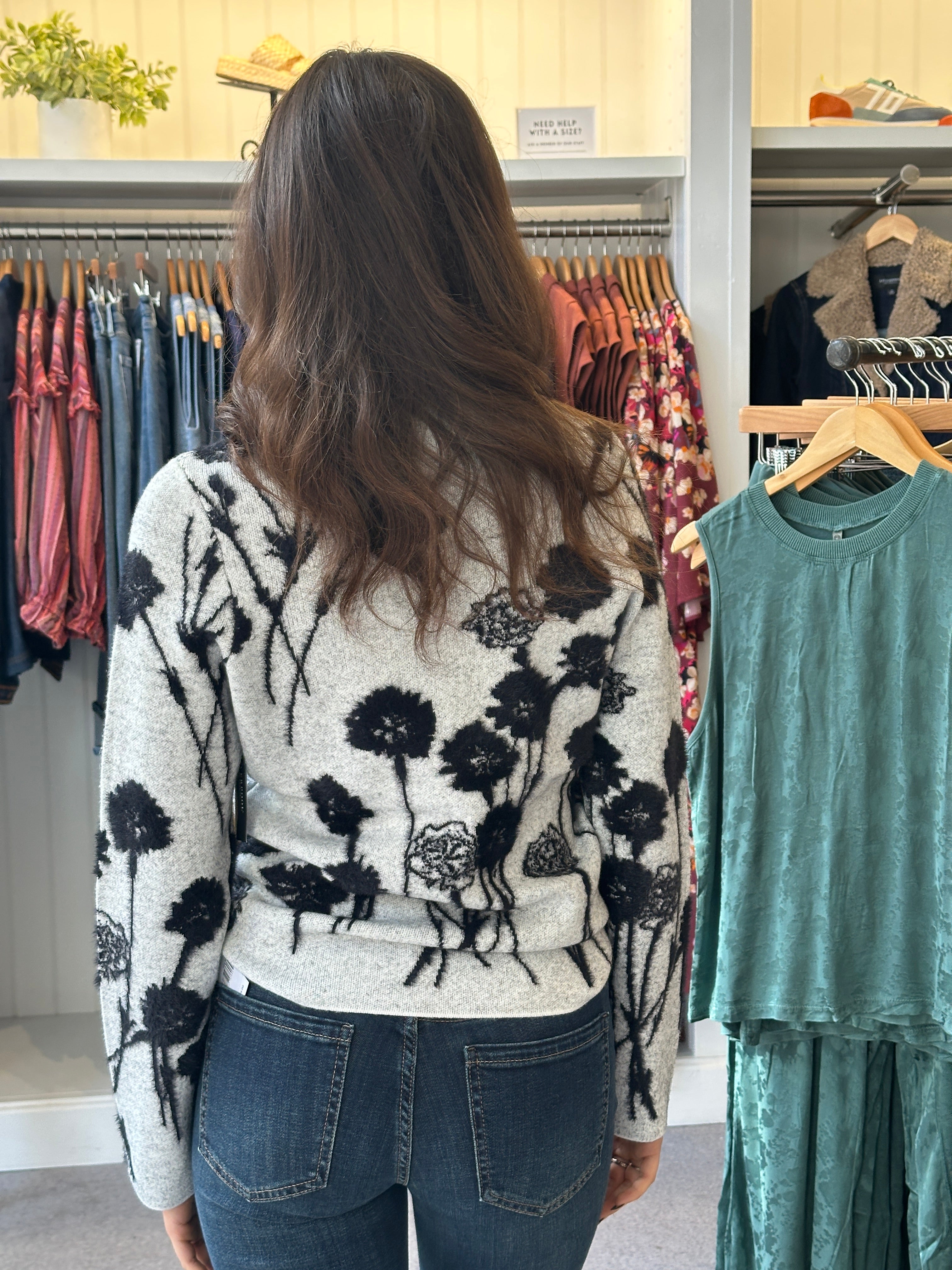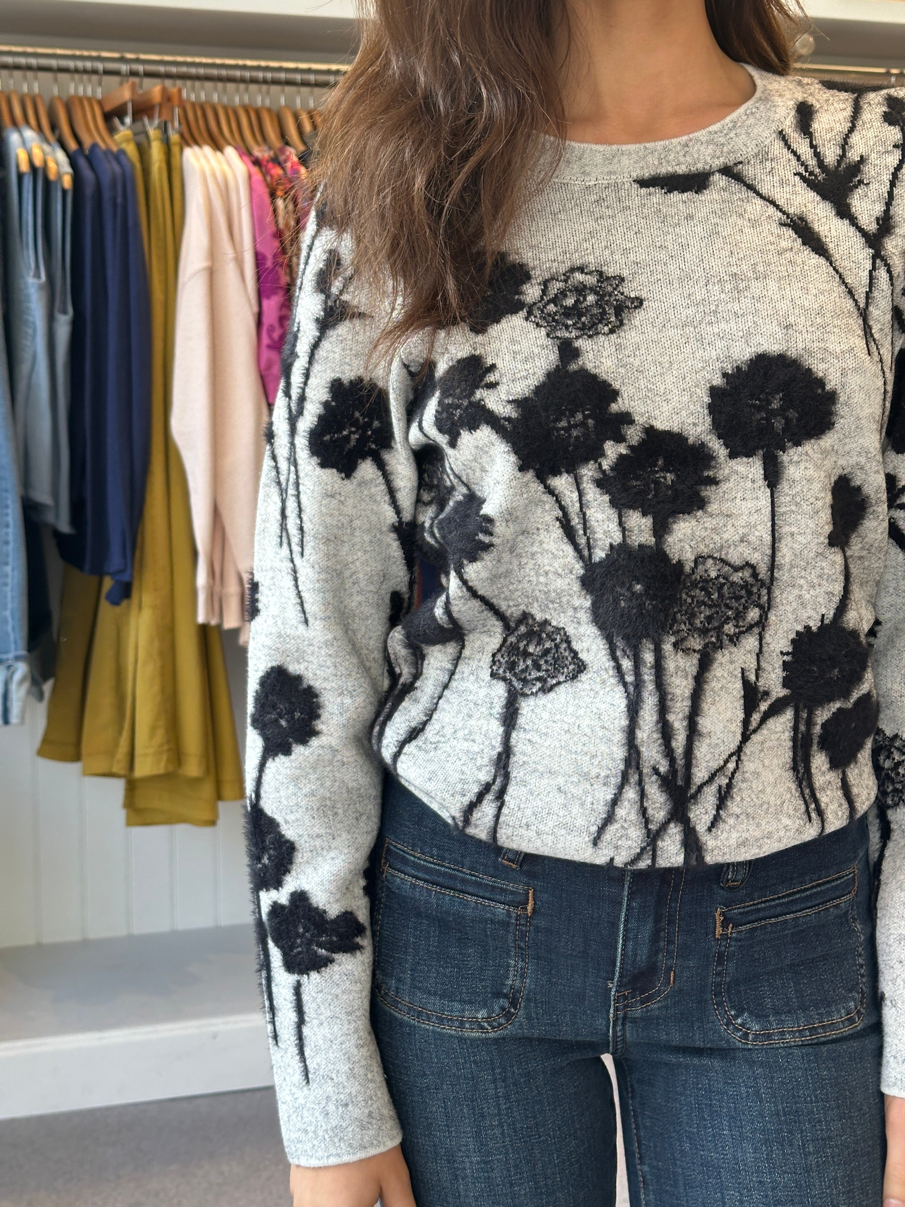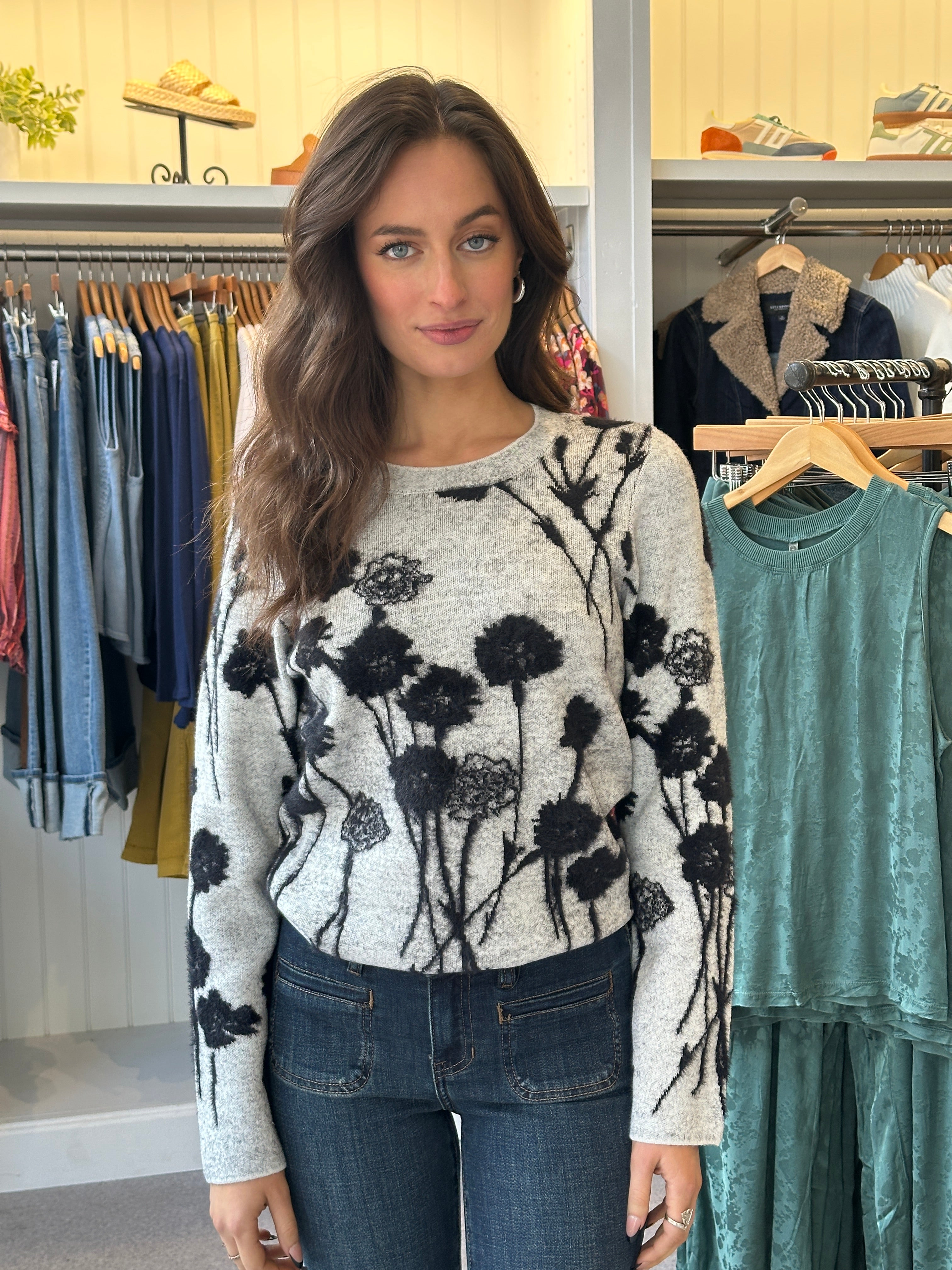 Wrap yourself in cozy charm with this Embossed Floral Sweater. Featuring super soft fabric in stylish gray and black hues, its raised floral appliqués add a lively, textured touch to your look. Perfect for adding a playful twist to your everyday outfit while keeping you comfy and warm.