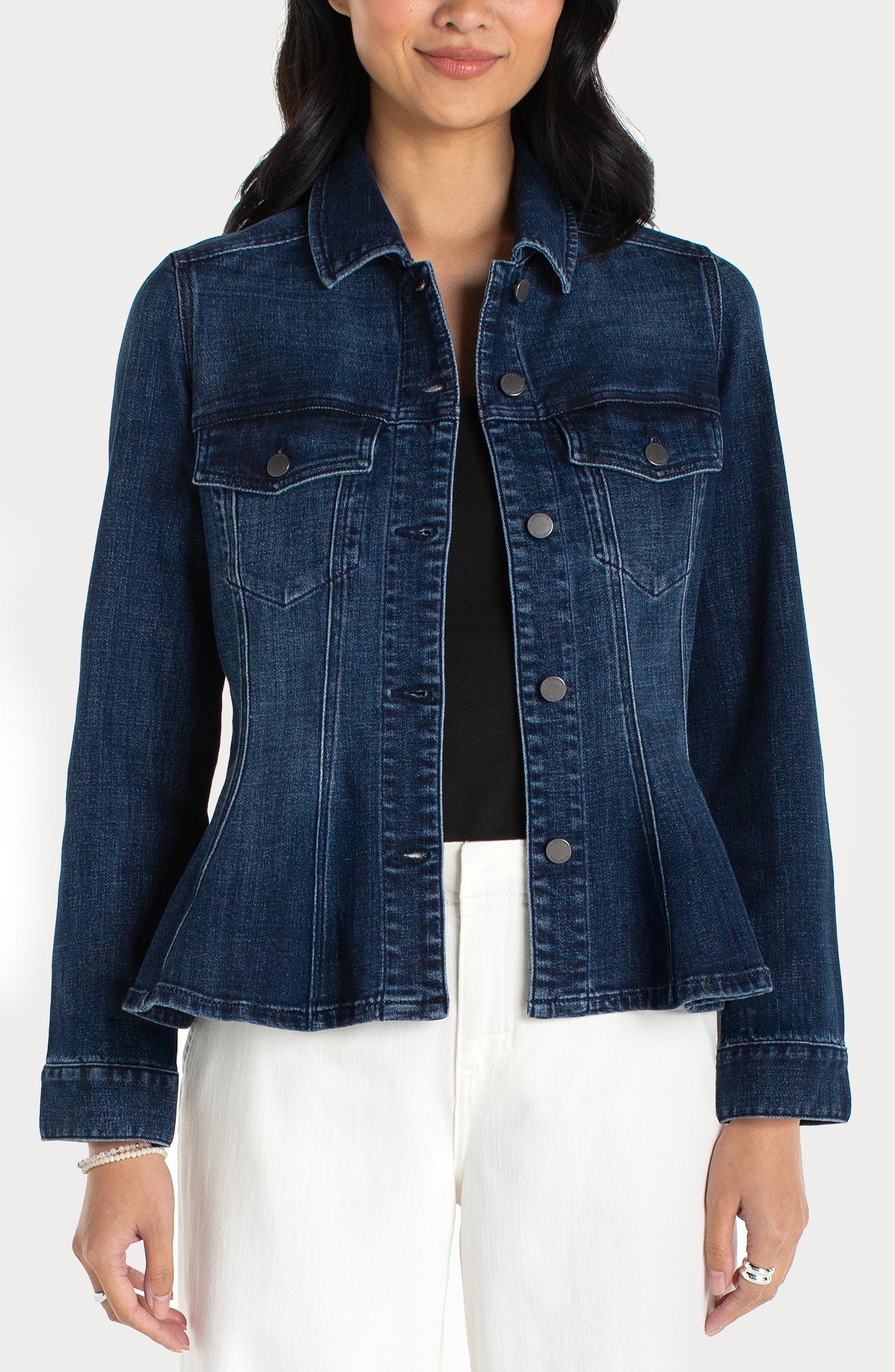 Rock a silhouette that's equal parts classic and cool with this flared denim jacket. The tailored design hugs where it counts, then flares out for a fun, flattering finish that works with everything from weekend jeans to dressed-up nights out. Versatile enough to throw over any outfit, this trucker-style essential brings effortless style and personality to your wardrobe.