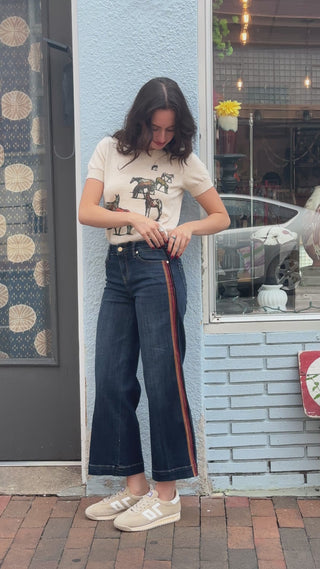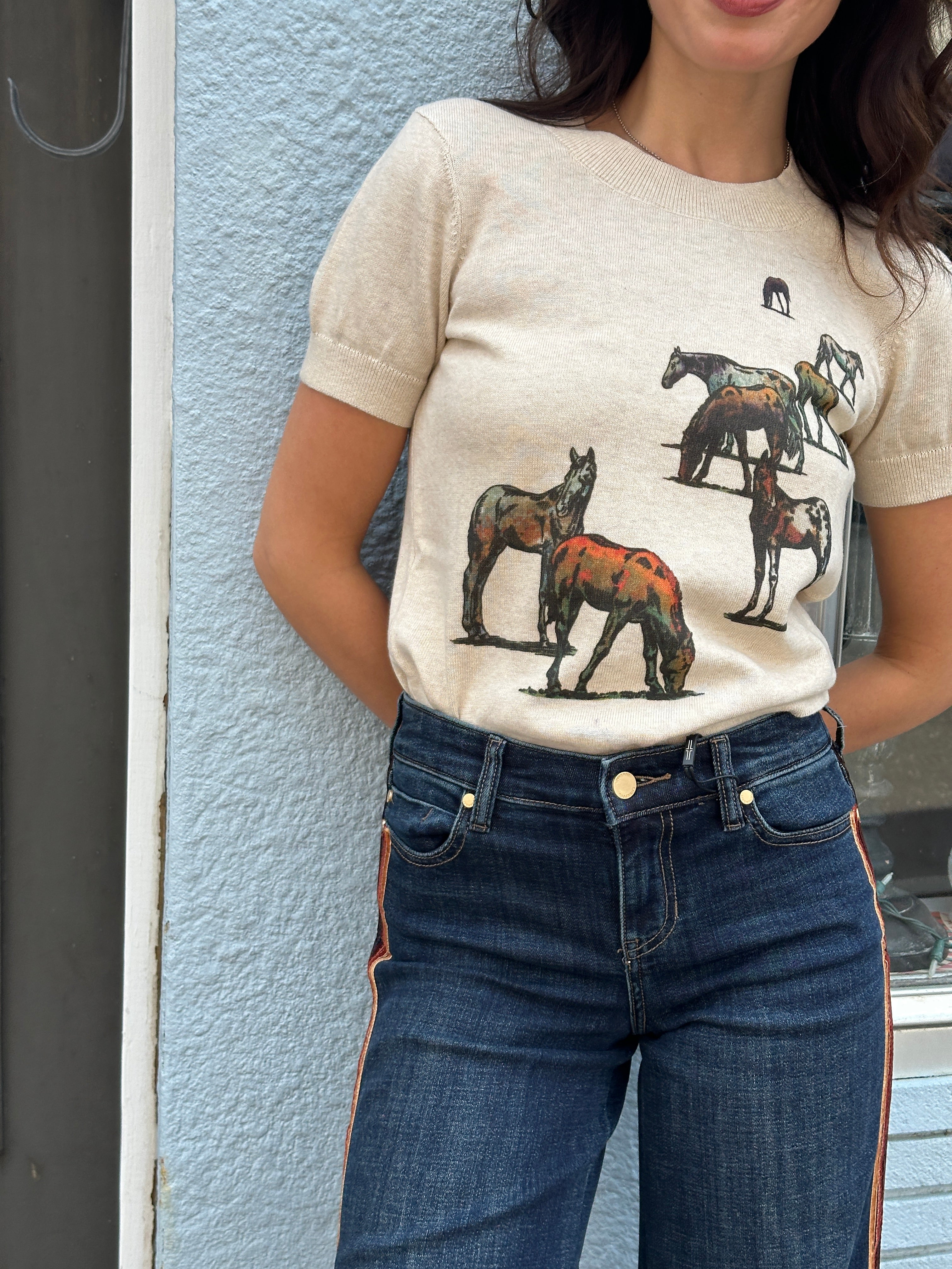 A statement knit celebrating the beauty of the wild mustang. This cotton sweater features a crew neckline, short sleeves and ribbed trim. An eye-catching layer that blends softness with strength.